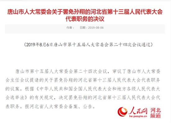 人民网石家庄8月6日电 据唐山发布官方微信消息,从唐山市人大常委会获悉,前不久,唐山市人大常委会在接到关于河北省十三届人大代表孙翔涉嫌双重国籍的举报后,高度重视,迅速通过有关部门及其本人进行调查核实。在确定属实后,于8月6日召开了市人大常委会第二十四次会议,依法罢免了孙翔的河北省第十三届人民代表大会代表职务。