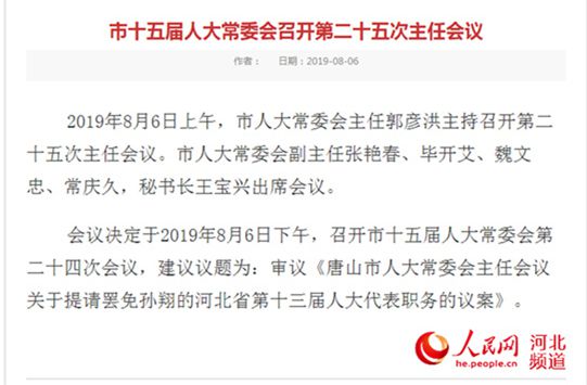据唐山市人大官网消息,6日上午,市人大常委会主任郭彦洪主持召开第二十五次主任会议。会议决定于2019年8月6日下午,召开市十五届人大常委会第二十四次会议,建议议题为:审议《唐山市人大常委会主任会议关于提请罢免孙翔的河北省第十三届人大代表职务的议案》。