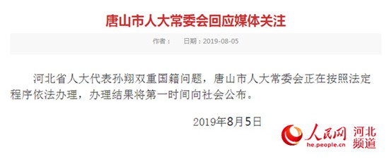 5日,唐山市人大常委会回应媒体关注称,正在按照法定程序依法办理河北省人大代表孙翔双重国籍问题。