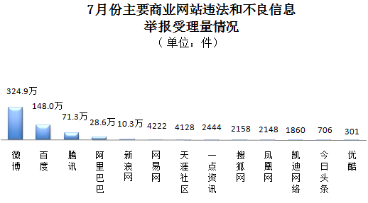在全国主要网站受理的举报中,微博、百度、腾讯、阿里巴巴、新浪网等主要商业网站受理量占61.1%,达585.0万件。
