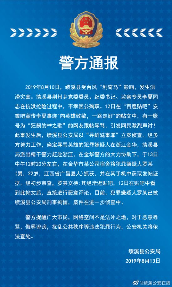 人民网北京8月14日电 据安徽省宣城市绩溪县公安局政工监督室官方微博消息,2019年8月10日,绩溪县受台风“利奇马”影响,发生洪涝灾害。绩溪县荆州乡党委委员、纪委书记、监察专员李夏同志在抗洪抢险过程中,不幸因公殉职。12日在“百度贴吧”安徽吧宣传李夏事迹向英雄致敬,一路走好”的帖文中,有一帐号为“狂飙的*之歌”的网友跟帖辱骂,引发网民激烈声讨!此事发生后,绩溪县公安局以“寻衅滋事罪”立案侦查。