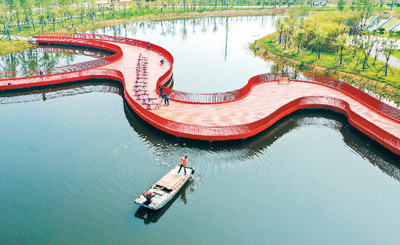 江苏省宿迁市泗洪县城北污水处理厂旁的尾水湿地公园,水上环卫工人正在水面打捞漂浮物。目前各地环卫工人收入普遍较低。