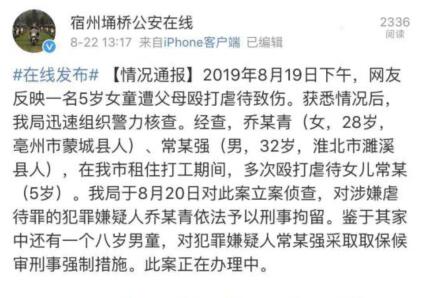 2019年8月19日下午,网友反映一名5岁女童遭父母殴打虐待致伤。获悉情况后,埇桥区公安分局迅速组织警力核查。经查,乔某青(女,28岁,亳州市蒙城县人)、常某强(男,32岁,淮北市濉溪县人),在宿州市租住打工期间,多次殴打虐待女儿常某(5岁)。公安部门于8月20日对此案立案侦查,对涉嫌虐待罪的犯罪嫌疑人乔某青依法予以刑事拘留。鉴于其家中还有一个八岁男童,对犯罪嫌疑人常某强采取取保候审刑事强制措施。此案正在办理中。