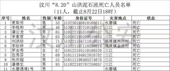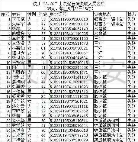 汶川特大山洪泥石流灾害遇难和失联人员名单更新 2019-08-23 09:03 人民网 扫描到手持设备 字号: 人民网成都8月22日电 (朱虹)记者从汶川县公安局获悉,汶川山洪泥石流灾害遇难和失联人员名单更新,目前灾害已致11人遇难,26人失联,其中1名遇难者身份待核实。 相关阅读 关键词: 汶川 泥石流 山洪 人员名单 灾害 应急管理部调度部署元旦假期安全防范工作2022-12-30 我市出台全省首部规章筑牢防雷减灾安全防线2022-12-27 重大气象灾害(寒潮)Ⅲ级应急响应启动2022-11-28 学习灾害知识 提升防范能力2022-10-21 滁州市民政局开展“早预警 早行动”第33个国际减灾日主题活动2022-10-14 “梅花”吹响我省灾害预警“双警报”2022-09-15 警惕山洪来袭!两部门联合发布橙色山洪灾害气象预警2022-05-30 2021年度滁州市新闻系列中级职称评审委员会评审通过人员名单公示2022-05-27 明光市烟草专卖局开展防灾减灾社区宣传活动2022-05-12 安徽省纪念第62个世界气象日2022-03-24 责任编辑:陈姝妤 复制网址 打印 收藏 关于我们 | 联系我们 | 加入我们 | 版权声明 | 手机访问 | 网站地图 | 留言反馈 | 我要投稿 中共滁州市委宣传部主办 滁州日报社承办 Copyright?2009-2010 Chuzhou.cn. All Rights Reserved 滁州日报社 版权所有 皖网宣备3412015001号 皖ICP备11004325号-1 热线电话:0550-3022685