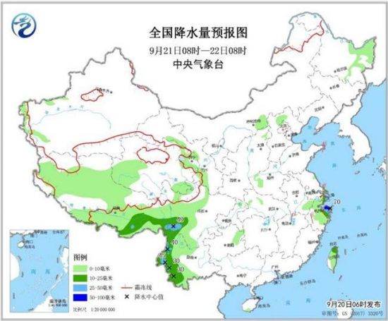 9月21日08时至22日08时,云南西部、川西高原南部、西藏东南部、浙江东部、上海、台湾岛等地部分地区有中到大雨,其中,浙江东北部、上海东部等地局地有暴雨(50~70毫米)。
