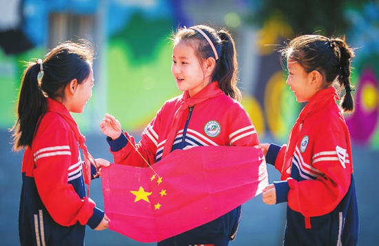 呼和浩特市玉泉区南茶坊小学生在绣国旗。 新华社供图