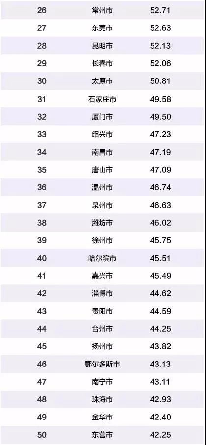 第三,从空间结构来看,百强城市由东向西呈阶梯式递减,三大经济圈集中度最高。