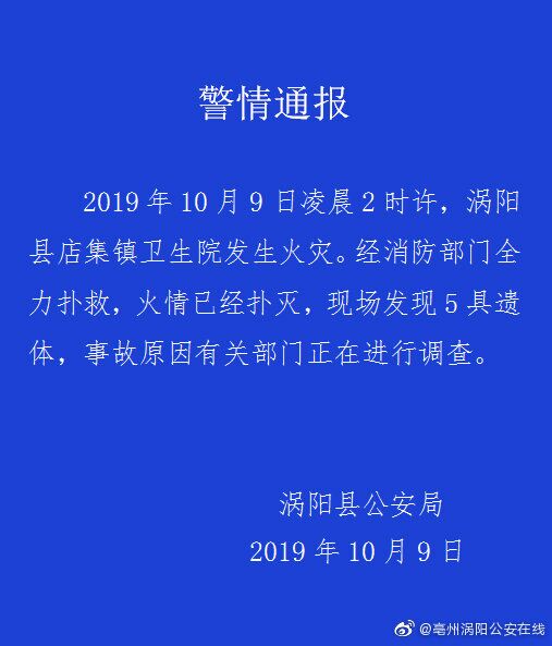 警情通报称:2019年10月9日凌晨2时许,涡阳县店集镇卫生院发生火灾。经消防部门全力扑救,火情已经扑灭,现场发现5具遗体,事故原因有关部门正在进行调查。