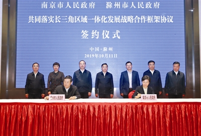 市长许继伟和南京市委常委、常务副市长杨学鹏分别介绍了两市经济社会发展情况。韩立明和许继伟分别代表两市政府签署了共同落实长三角区域一体化发展战略合作框架协议,江北新区与来安县、浦口区与南谯区分别签署了跨界一体化示范区共建框架协议。