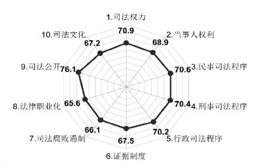 1.司法文明指数10个一级指标的最大分差为10.5分,比2017年最大分差11.4分缩小了0.9分。从10个一级指标的平均得分来看,“司法公开”得分最高(76.1分),“法律职业化”得分最低(65.6分),反映了司法改革的成效还不够明显;一级指标“司法腐败遏制”得分倒数第二(66.1分,比2017年的66.6分又低了0.5分),反映了人民群众对其满意度较低。