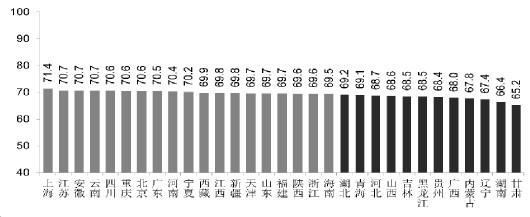 2.如下19个省、自治区、直辖市的得分在平均分及以上,包括:上海(71.4)、江苏(70.7)、安徽(70.7)、云南(70.7)、四川(70.6)、重庆(70.6)、北京(70.6)、广东(70.5)、河南(70.4)、宁夏(70.2)、西藏(69.9)、江西(69.8)、新疆(69.8)、天津(69.7)、山东(69.7)、福建(69.7)、陕西(69.6)、浙江(69.6)、海南(69.5);其余12个省、自治区、直辖市的得分均在平均分(69.3分)以下。