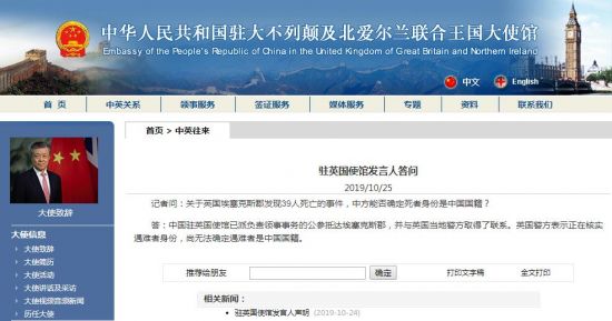 人民网北京10月25日电 据中国驻英国大使馆官网消息,针对在英国埃塞克斯郡发现的39具尸体的身份问题,中国驻英国使馆发言人表示,使馆已派负责领事事务的公参抵达埃塞克斯郡,并与英国当地警方取得了联系。英国警方表示正在核实遇难者身份,尚无法确定遇难者是中国国籍。