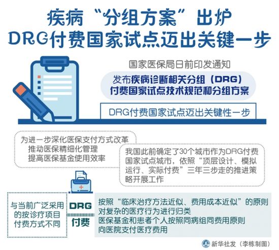 新华社北京10月24日电(记者张泉)国家医保局日前印发通知,发布疾病诊断相关分组(DRG)付费国家试点技术规范和分组方案,DRG付费国家试点迈出关键性一步。