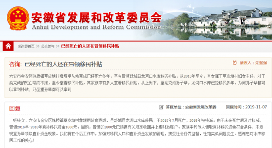安徽网、大皖客户端讯 近日,有网友向安徽省发改委官网举报已经死亡的人还在冒领移民补贴 。安徽省发改委回复:经核实,六安市金安区施桥镇草皮塘村詹堰闸队俞克成,是舒城县龙河口水库移民,于2015年7月死亡,2019年被核减。由于未在死亡后及时核减,冒领2016年-2018年直补移民资金1800元。具体如下: