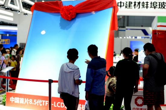 观众在2019世界制造业大会上参观中国首片8.5代TFT-LCD玻璃基板(9月22日摄)。新华社发(黄博涵 摄)