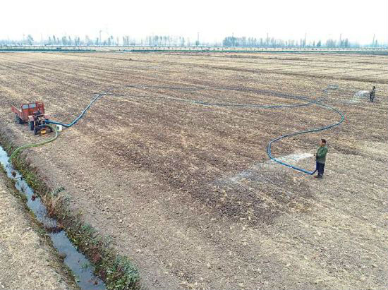 11月12日,长丰县孔圩社区的农民在引水为受旱小麦喷灌,抗旱保苗。记者 范柏文/摄