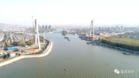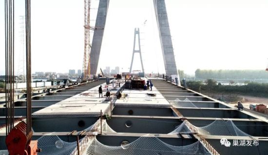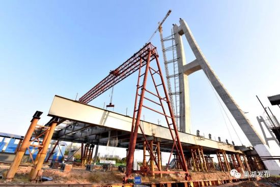 目前巢湖大桥的主体结构已经全部结束,正在进行主梁和斜拉索施工,接下来主要进行主梁施工和附属工程施工。