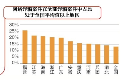此次发布的《报告》主要对2016年至2018年全国法院审理的网络犯罪案件进行了分析。最高人民法院信息中心副主任孙福辉表示,网络犯罪案件方面,案件量及在全部刑事案件总量中的占比均呈逐年上升趋势。2018年案件量显著增加,同比升幅为50.91%。其中大部分案件分布于东南沿海,京、沪、津、渝地区法院审结网络犯罪案件合计总量仅占6.81%。福建、浙江、山西等十地利用网络手段实施犯罪的案件占比超过全国平均水平。