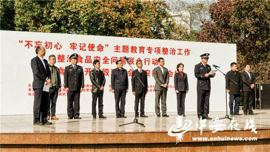 当天,在合肥分会场,安徽省整治食品安全问题联合行动工作组通报了全省整治食品安全问题联合行动工作情况,发布了整治食品安全问题联合行动期间查办的十大典型案例,公开销毁过期食品、假酒、不合格预包装食品和食用农产品等共计31吨。