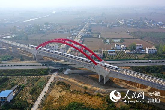 列车从商合杭高铁跨滁新高速公路大桥上经过。任长波 摄