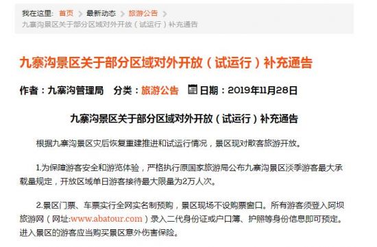 据九寨沟风景名胜区管理局官网28日消息,九寨沟风景名胜区管理局发布《九寨沟景区关于部分区域对外开放(试运行)补充通告》,根据九寨沟景区灾后恢复重建推进和试运行情况,景区现对散客旅游开放。具体内容如下——