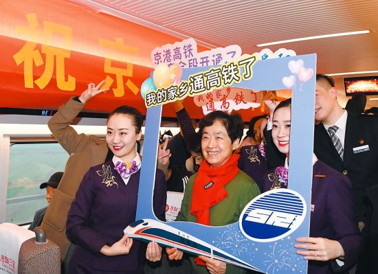 12月1日,合肥客运段工作人员和旅客在阜阳西站开往上海虹桥站的G7787首发列车上合影。 安徽日报记者 吴文兵 摄