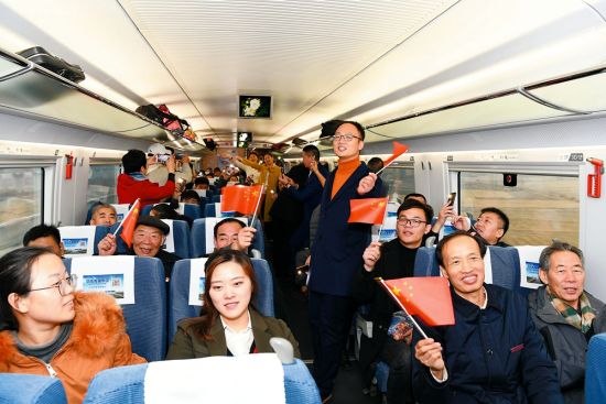 12月1日,在阜阳西开往合肥站的高速列车内,阜阳微宣讲成员与乘客一起高唱《歌唱祖国》等歌曲,庆祝阜阳开通高铁。 安徽日报通讯员 郭海洋 摄