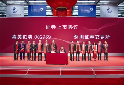 图为深交所与嘉美包装签署《证券上市协议》。 市地方金融局供图