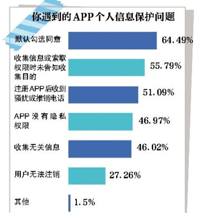 根据通报,此次公安部要求100款APP整改的主要问题包括无隐私协议、收集使用个人信息范围描述不清、超限索权等。而根据南都个人信息保护研究中心发布的《2019个人信息安全年度报告》,在普通用户看来,默认勾选同意、收集信息未告知收集目的、注册APP后收到骚扰或推销电话是最为严重的个人信息保护问题。