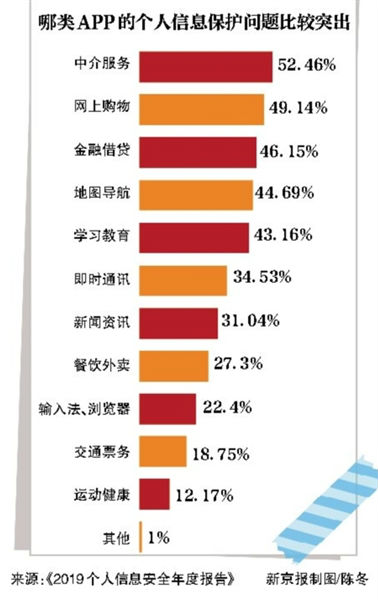 新京报记者注意到,此次通报涉及的APP包含多个行业。根据《2019个人信息安全年度报告》,普通用户认为中介服务类、网上购物类、金融借贷类APP的个人信息保护问题最为突出。