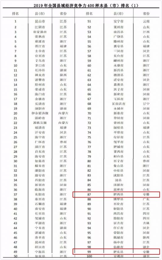 据安徽省人民政府发布微信号消息,近日,由中国社会科学院财经战略研究院县域经济课题组完成的《中国县域经济发展报告(2019)》(以下简称《报告》)正式发布,同时,2019年全国综合竞争力百强县(市)、投资潜力百强县(市)名单也对外公布。
