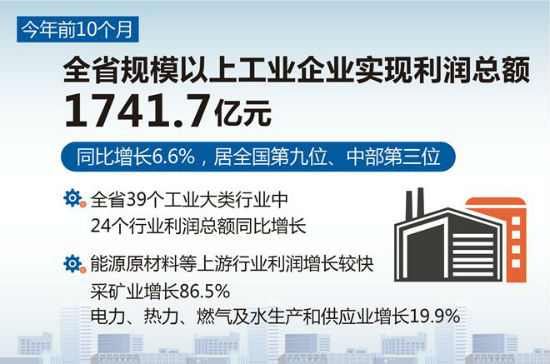 省统计局发布最新统计数据,今年前10个月,在全国规模以上工业企业利润总额同比下降2.9%的大势下,全省规模以上工业企业实现利润总额1741.7亿元,同比增长6.6%,居全国第九位、中部第三位。