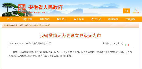 重磅!无为撤县设市,由安徽直辖! 2019-12-17 08:57 中安在线 彭旖旎 扫描到手持设备 字号: 中安在线、中安新闻客户端讯 记者从安徽省政府网站获悉,日前,经国务院批准,民政部批复同意撤销无为县,设立县级无为市。以原无为县的行政区域为无为市的行政区域,无为市人民政府驻无城镇二坝路1号。无为市由安徽省直辖,芜湖市代管。(记者 彭旖旎) 复制网址 打印 收藏 关于我们 | 联系我们 | 加入我们 | 版权声明 | 手机访问 | 网站地图 | 留言反馈 | 我要投稿 中共滁州市委宣传部主办 滁州日报社承办 Copyright?2009-2010 Chuzhou.cn. All Rights Reserved 滁州日报社 版权所有 皖网宣备3412015001号 皖ICP备11004325号-1 热线电话:0550-3022685