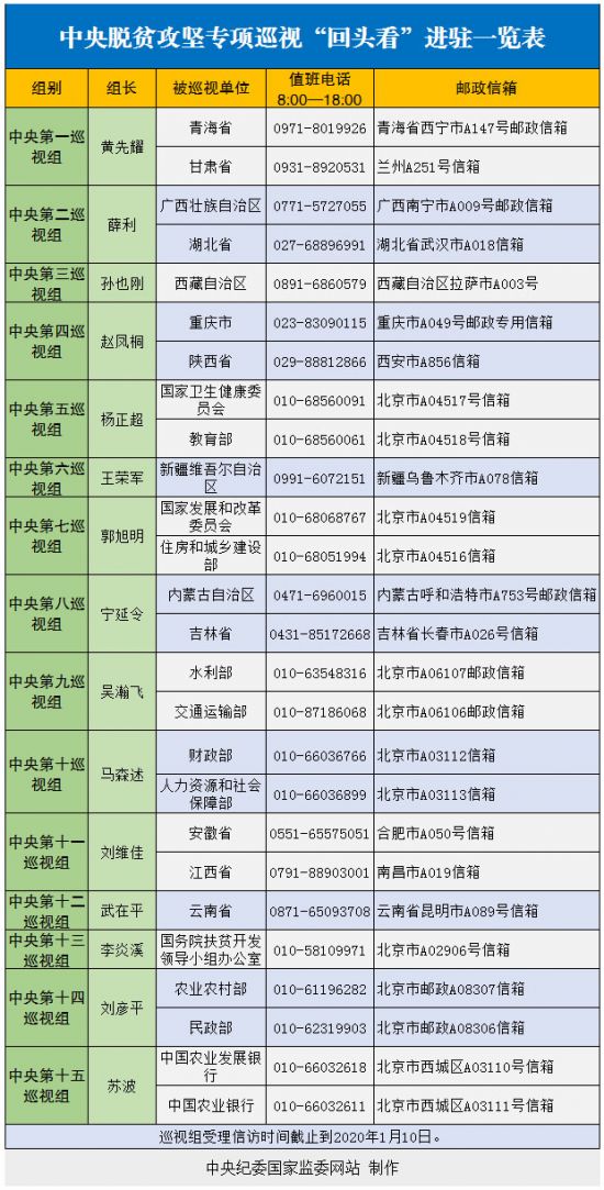 据悉,各中央巡视组将在被巡视地区单位工作20天左右,期间设立专门值班电话和邮政信箱,主要受理反映脱贫攻坚专项巡视整改方面问题的信访举报。每天受理电话的时间为8:00至18:00,信访截止时间为2020年1月10日。