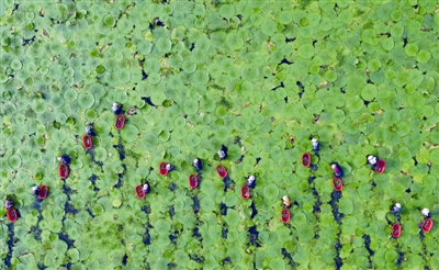 琅琊区三官街道八里村的山珊芡实家庭农场内,1200多亩芡实获得丰收。该农场实行芡实和黑鱼共养,实现年总收益超1000万元。图为当地农民正在采摘芡实。