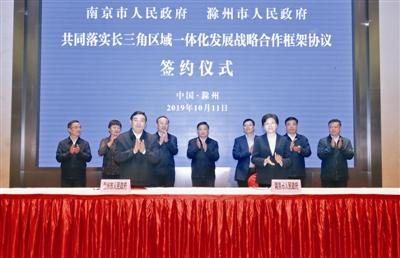 宁滁两地签署“1+2”合作框架协议,即宁滁两市共同落实长三角区域一体化发展战略合作框架协议。