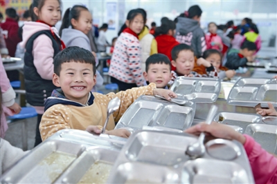 小学生们在展示吃光饭菜的盘子。