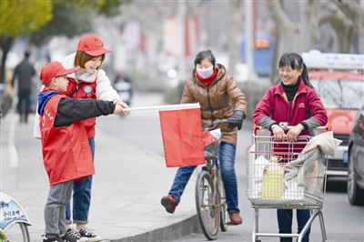 解放小学的小学生志愿者和家长一起在街头维护交通秩序。