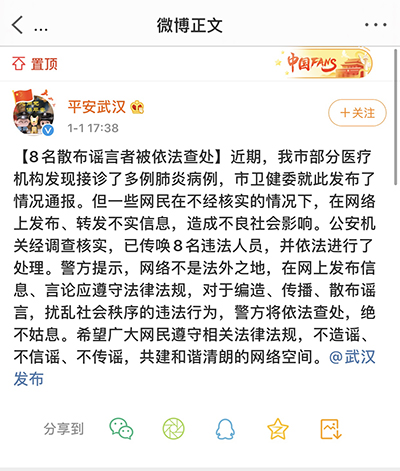 人民网武汉1月1日电 (肖璐欣)1日下午,武汉市公安局官方微博发布消息称,关于武汉市肺炎疫情的情况,8名散布谣言者,已被依法查处。