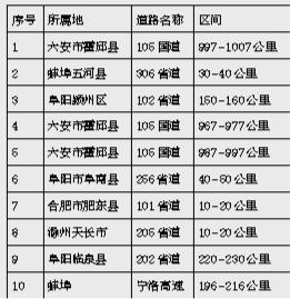 根据2019年安徽省道路交通事故统计数据有关情况,我省排查出交通事故多发、死亡人数集中的10个路段。这10个路段分布在国省道和高速公路,共计里程100公里。