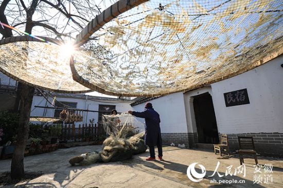姥山岛居民吴智敌正在整理晾晒的渔获。张俊 摄