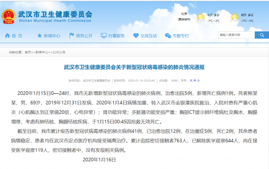 人民网北京1月17日电 据武汉市卫生健康委员会网站消息,2020年1月15日0—24时,武汉市无新增新型冠状病毒感染的肺炎病例,治愈出院5例,新增死亡病例1例。死者熊某某,男,69岁,2019年12月31日发病,2020年1月4日病情加重,转入武汉市金银潭医院救治,入院时患有严重心肌炎(心肌酶达到正常值20倍,心电异常);肾功能异常;多脏器功能受损严重;胸部CT提示肺纤维病灶及胸水、胸膜增厚,考虑有肺结核、胸膜结核疾病,于1月15日00:45因抢救无效死亡。