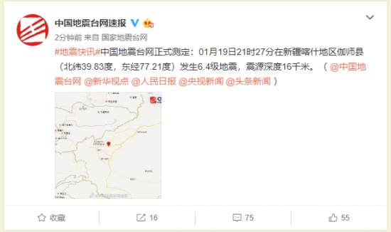 新疆喀什地区伽师县发生6.4级地震 2020-01-20 08:04 人民网 扫描到手持设备 字号: 人民网北京1月19日电 中国地震台网正式测定:01月19日21时27分在新疆喀什地区伽师县(北纬39.83度,东经77.21度)发生6.4级地震,震源深度16千米。 (微博截图) 复制网址 打印 收藏 关于我们 | 联系我们 | 加入我们 | 版权声明 | 手机访问 | 网站地图 | 留言反馈 | 我要投稿 中共滁州市委宣传部主办 滁州日报社承办 Copyright?2009-2010 Chuzhou.cn. All Rights Reserved 滁州日报社 版权所有 皖网宣备3412015001号 皖ICP备11004325号-1 热线电话:0550-3022685