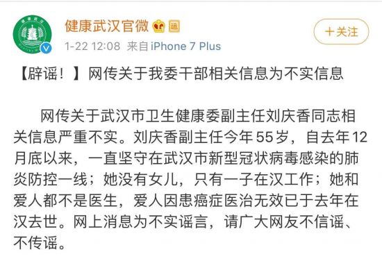 人民网北京1月22日电 据健康武汉官微消息,1月22日,武汉市卫健委发布辟谣声明,称网传关于武汉市卫生健康委副主任刘庆香同志相关信息严重不实。刘庆香副主任今年55岁,自去年12月底以来,一直坚守在武汉市新型冠状病毒感染的肺炎防控一线;她没有女儿,只有一子在汉工作;她和爱人都不是医生,爱人因患癌症医治无效已于去年在汉去世。网上消息为不实谣言,请广大网友不信谣、不传谣。