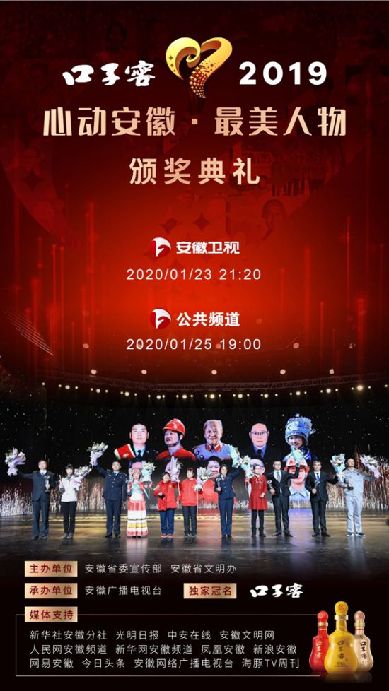 中安在线、安徽文明网、中安新闻客户端讯 由安徽省委宣传部、安徽省文明办主办的2019“心动安徽·最美人物”评选活动颁奖典礼将于1月23日晚21:20在安徽电视台卫视频道播出。届时,安徽新媒体集团中安在线网站、安徽文明网、中安新闻客户端、中安视频以及安徽网络电视台将同步播出。