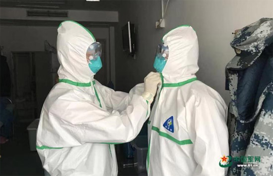 空军军医大学医疗队西京医院重症医疗组宋立强副组长(左)帮助中国军网记者高辉(右)穿防护装备。 胡世颉 摄
