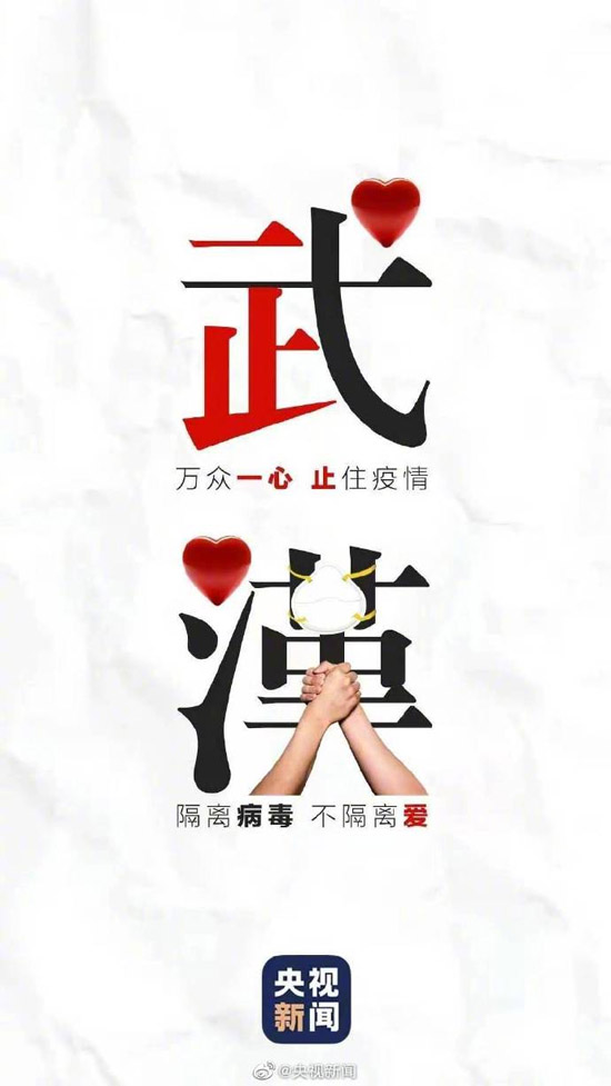 “万众一心 止住疫情”“隔离病毒 不隔离爱”。央视新闻官方微博29日发布的写有“武汉”两个大字的海报,阅读数超1700万,一张海报,传递出全国与身处疫情中心的武汉人民,手与手紧紧相握,心与心永远相连。