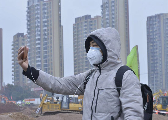 人民网记者崔东在火神山医院建设工地现场做连线直播