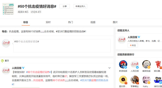 人民日报法人微博发起的话题#50个抗击疫情好消息#,登上微博热搜榜,截至目前阅读3.8亿,讨论5.2万。不少网友纷纷留言,“消息越来越好了”“武汉加油,中国加油!”“我的国家真棒”“人民的力量是不可战胜的”。