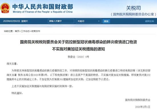 人民网北京2月2日电 据国务院关税税则委员会网站消息,为积极支持新型冠状病毒感染的肺炎疫情防控工作,对按照防控新型冠状病毒感染的肺炎疫情进口物资免税政策进口且原产于美国的物资,不实施对美加征关税措施,即恢复我对美232措施所中止的关税减让义务、不加征我为反制美301措施所加征的关税;已加征税款予以退还。